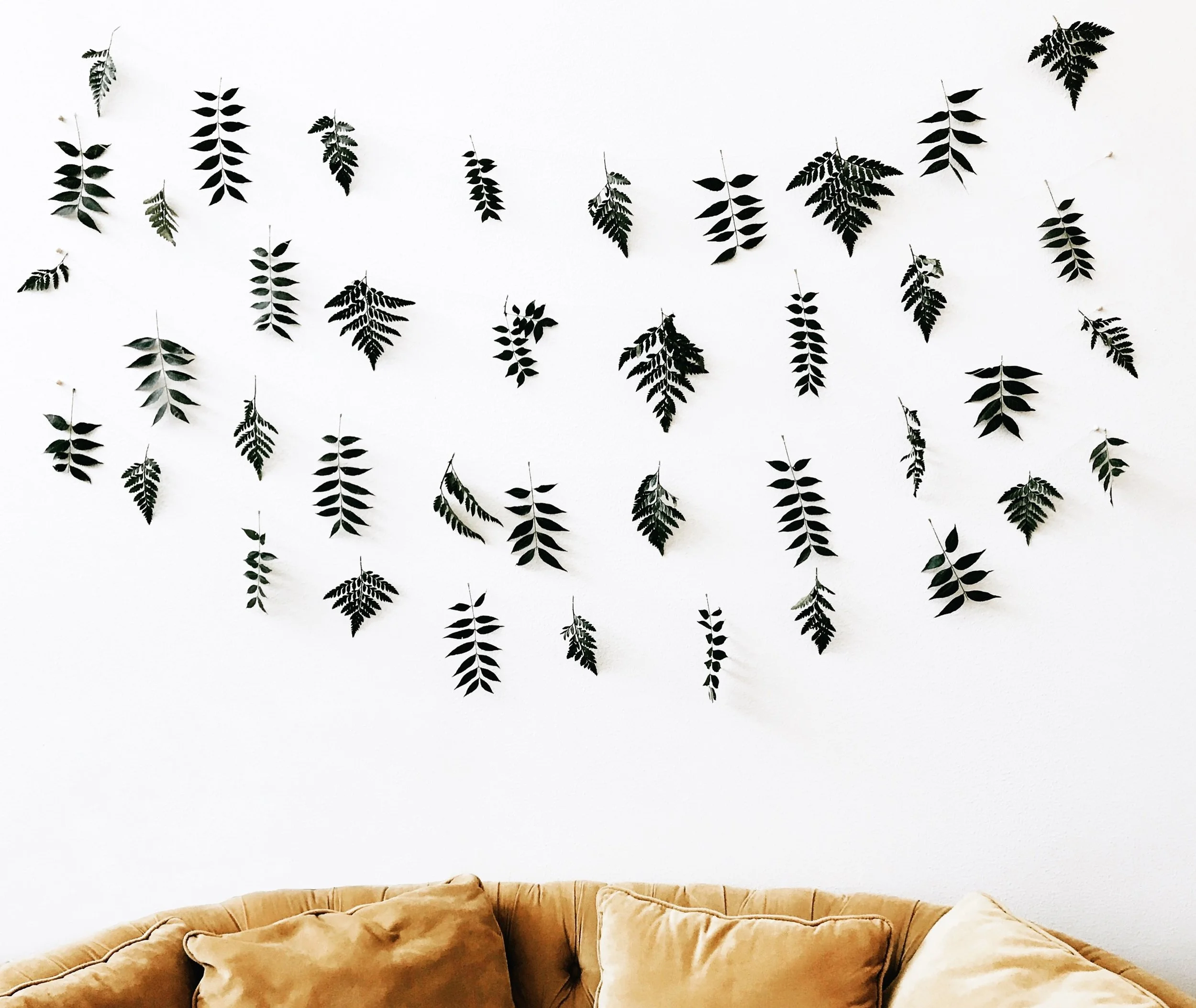 To put it together, simply cut a strand of hempmcord to your desirable length. I used a straightener to iron out all off the kinks so that it would hang naturally. Add an assortment of greens equidistant from each other, alternating types of greenery. Tack the ends to a wall, and you're done!