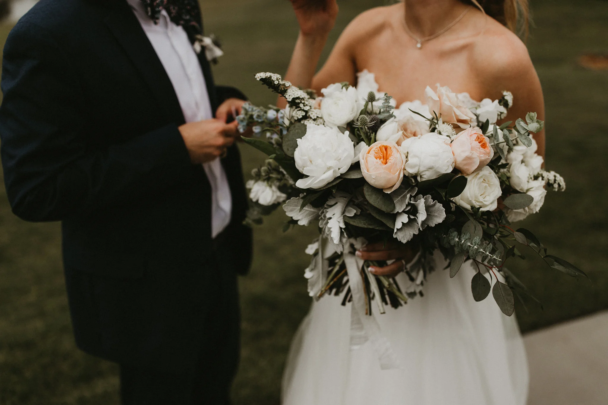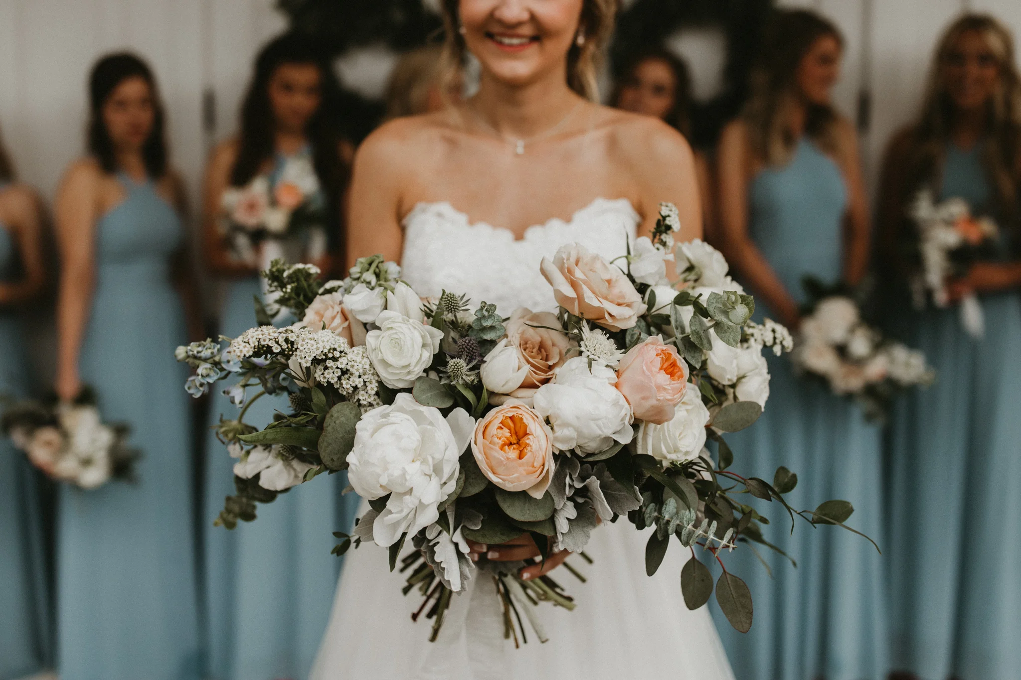 For Jess's bouquet, we used some beautiful big blooms. Those peachy stunners are David Austen's Juliet Garden roses, a favorite of mine when the pallet allows. The other main blooms are white peonies (gahh I love them), quicksand roses, and white ranunculus. We played with some fun accents and textures on her bouquet using spirea as a base, sweet peas, tulips, blue delphinium, and of course that pop of blue thistle.