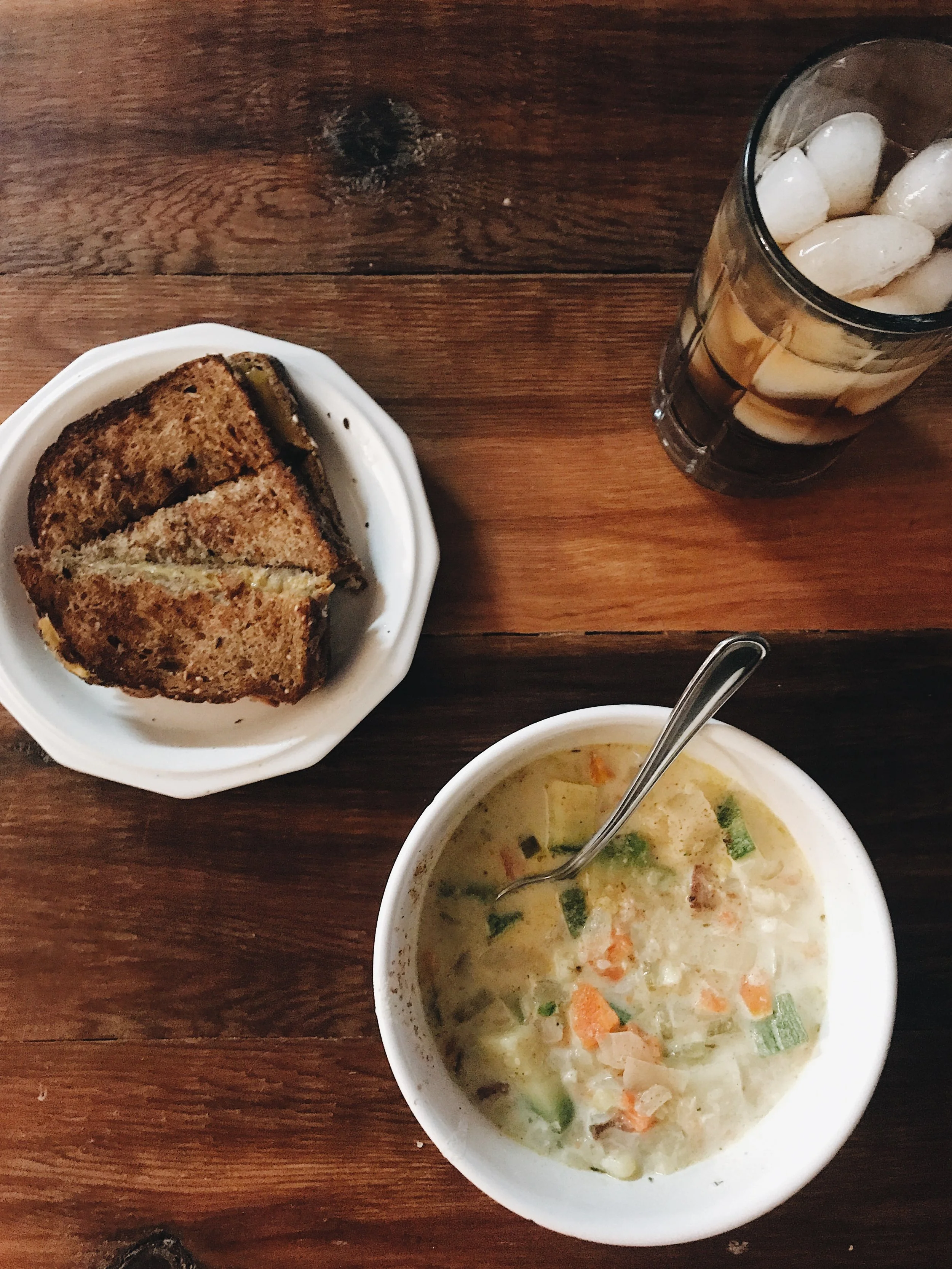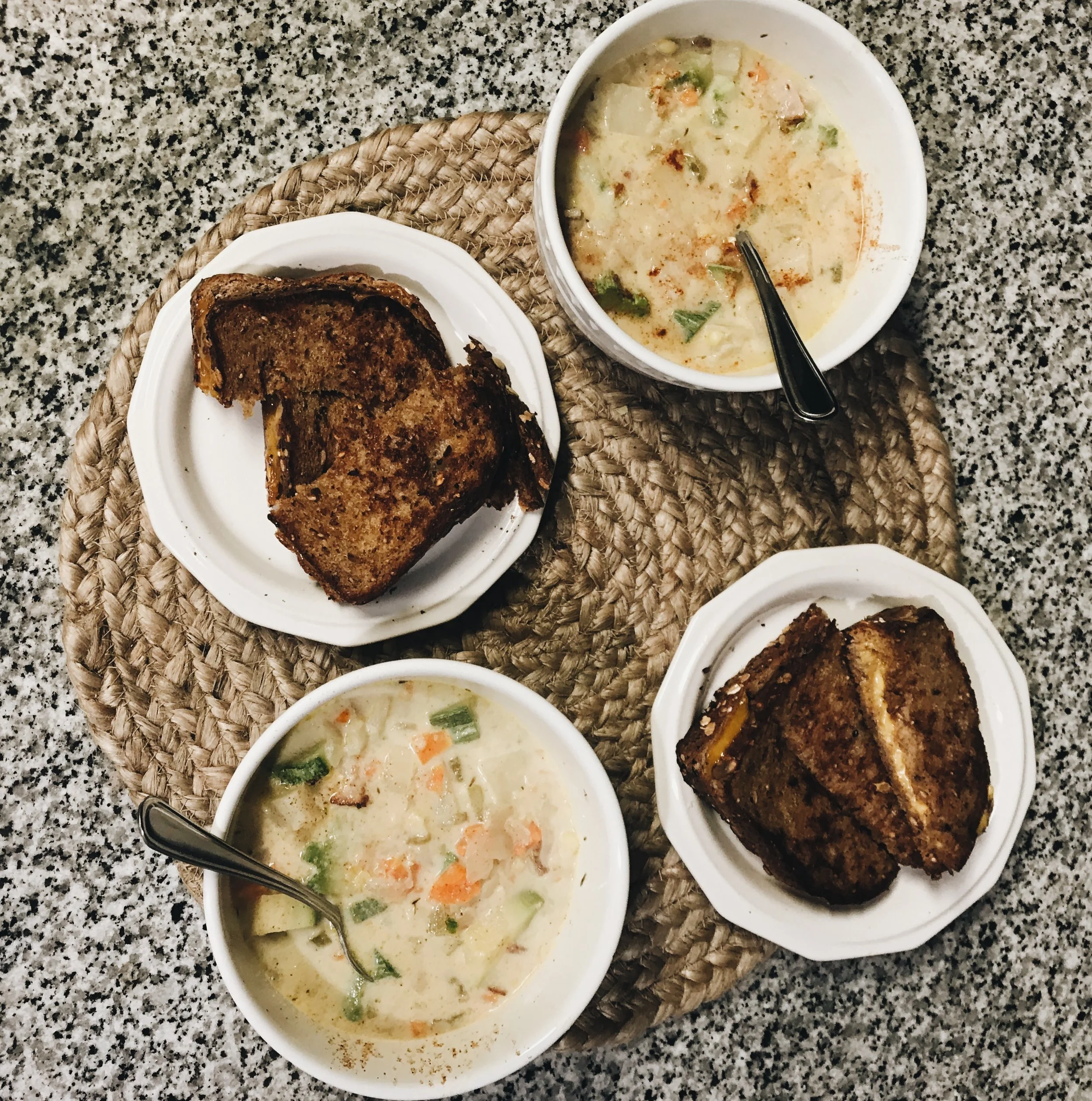 To go with the chowder, I made us some grilled cheese using my favorite bread ever, Dave’s Killer Bread- 21 Grains and Whole Seeds. And of course, a glass of half sweetened tea that I like to brew up and keep loaded in our fridge. Keeps me away from chick fil a.