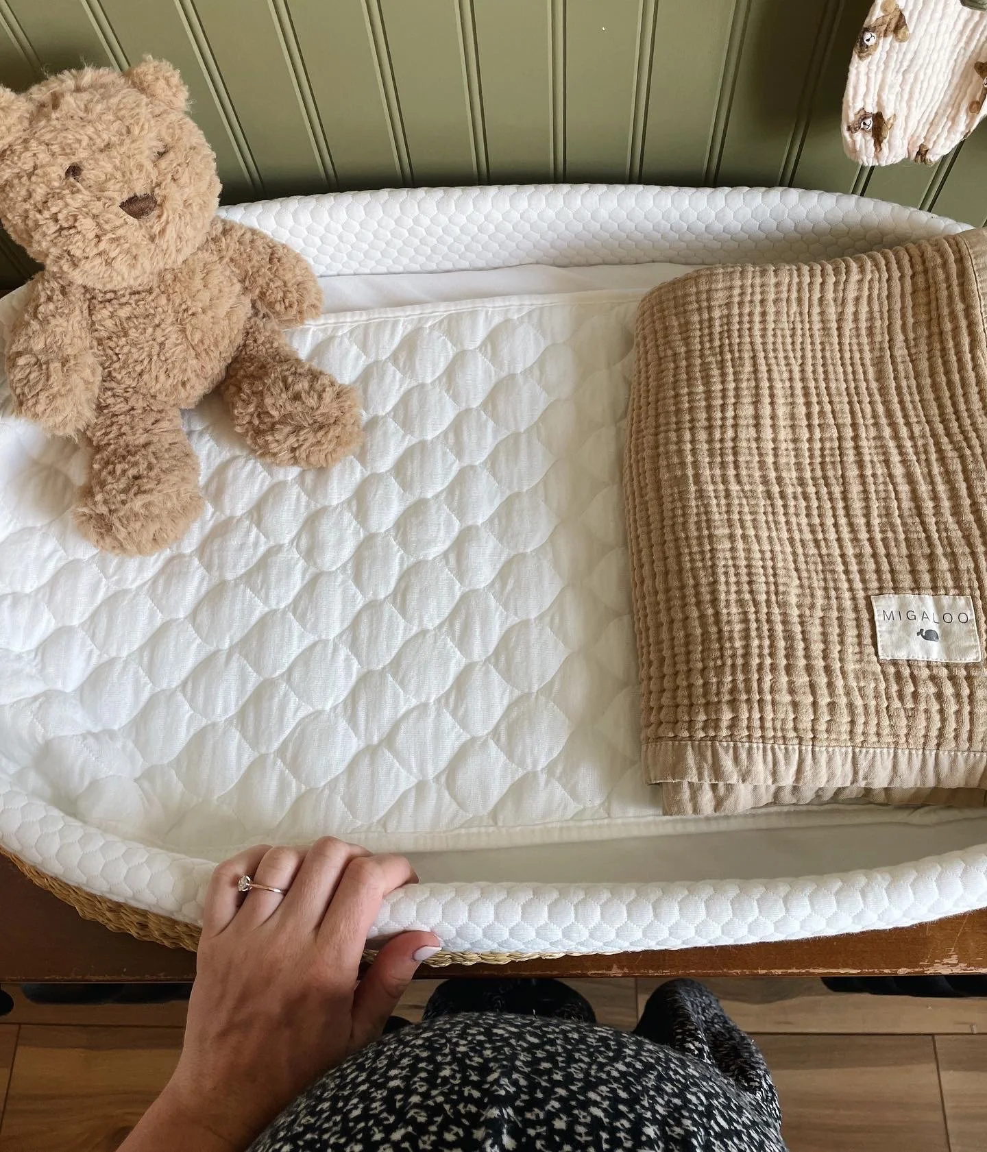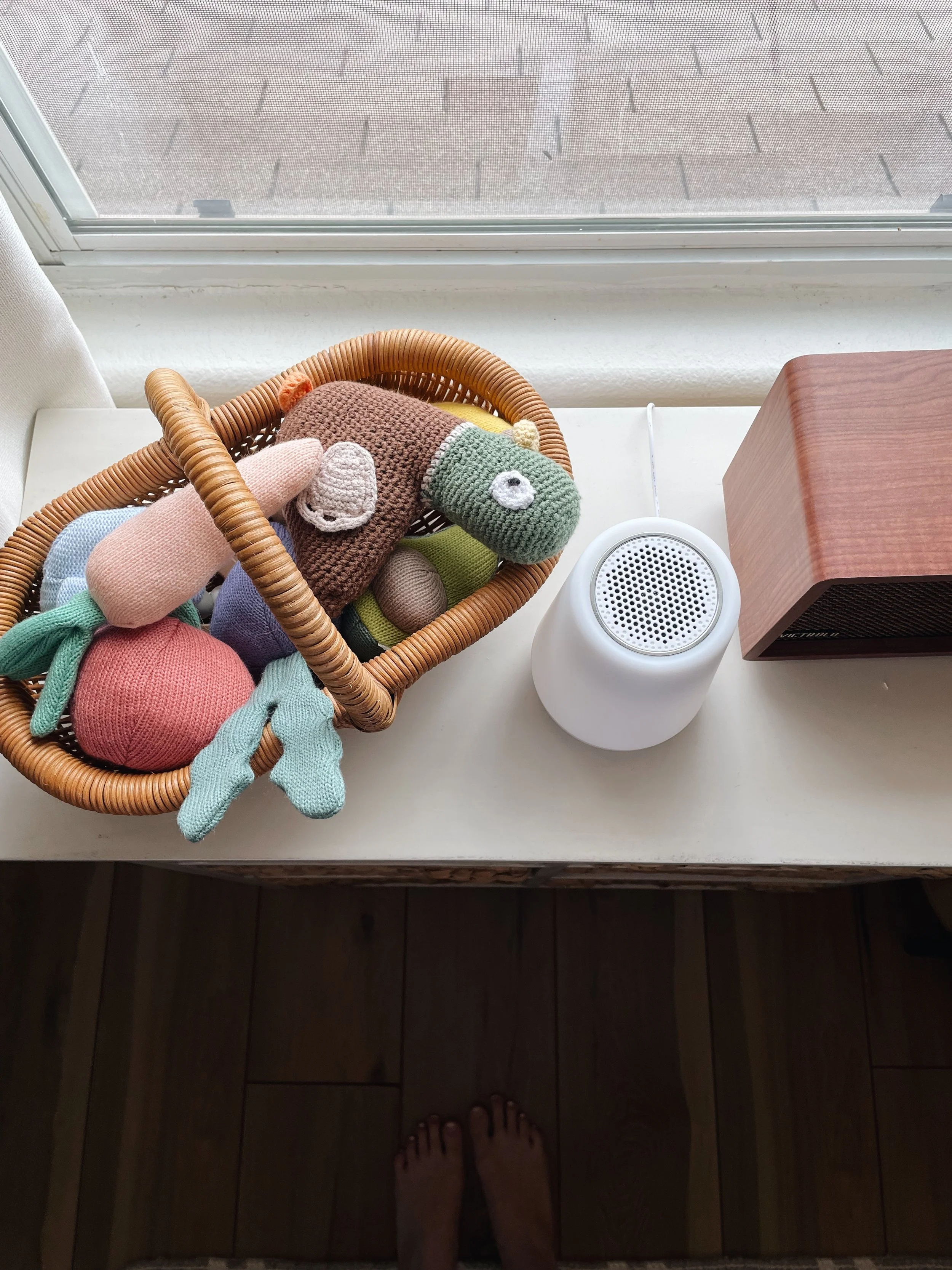The dresser is from Target and it’s actually supposed to be a changing table, I just didn’t get the changing table top and instead added the changing table basket from Design Dua that matches our bassinet. I’ve loved this setup so much!