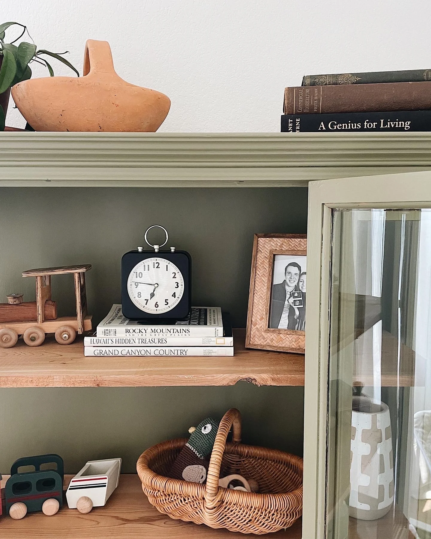 The olive green cabinet is the first piece I bought for the nursery and really was the main inspo for the room. I bought it off Facebook marketplace so I don’t have a link to it sadly. It was an orange color when I bought it and my mom helped me paint it this beautiful green using paint from Melange paints which was a dream to paint with. We ended up using the same color for the beadboard accent wall!
