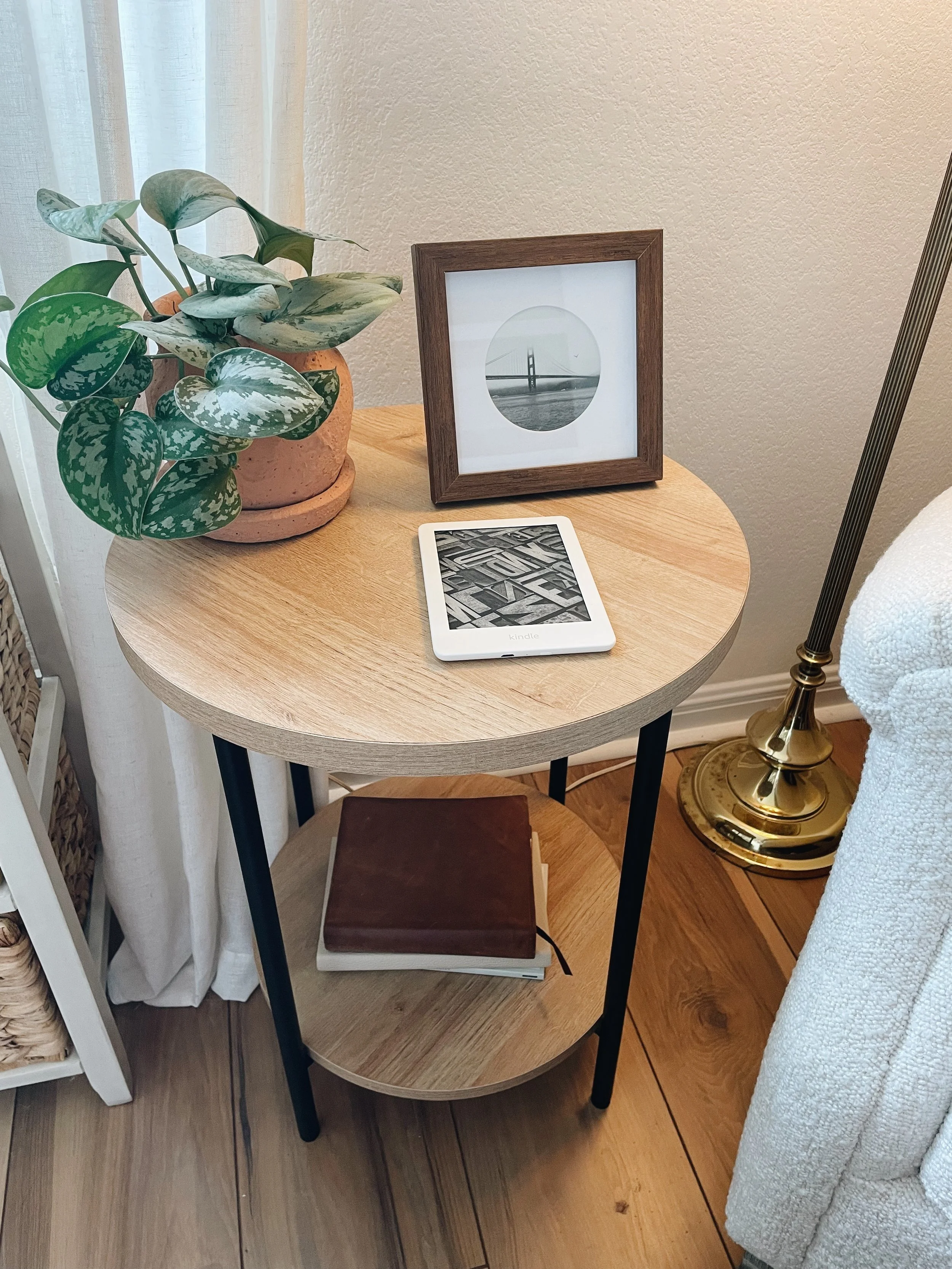 My dream rocker! This rocker is the Minna Rocker from Pottery Barn and I got it in the material ivory performance brushed boucle. It’s a small space rocker and I love how it fits in the space. I didn’t get the ottoman that goes with it and instead got this brown leather one from Target. I ended up taking off the legs on it and adding black vintage looking wheels so that it was easily movable!