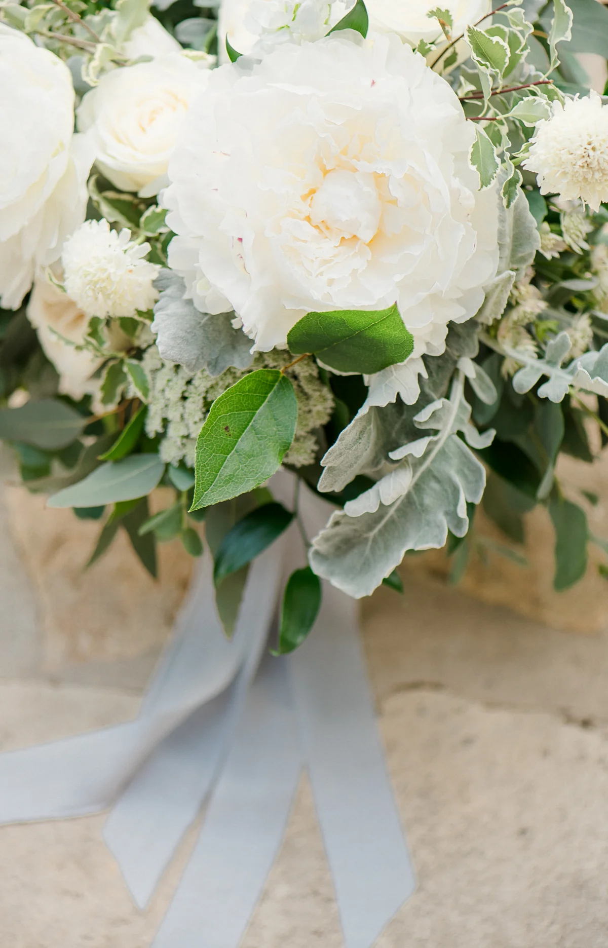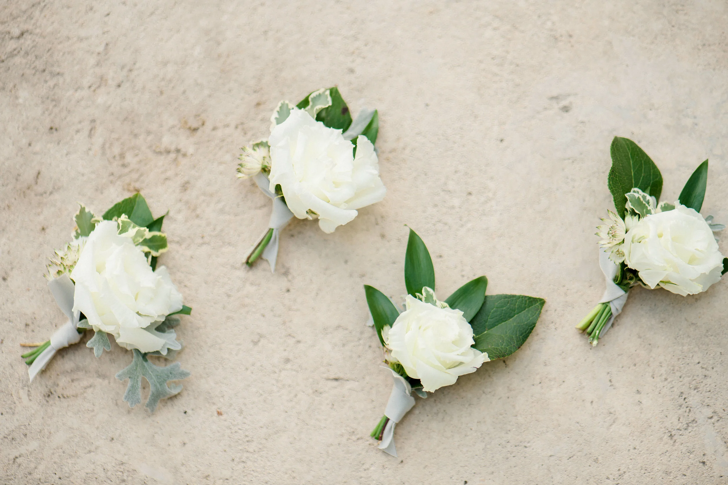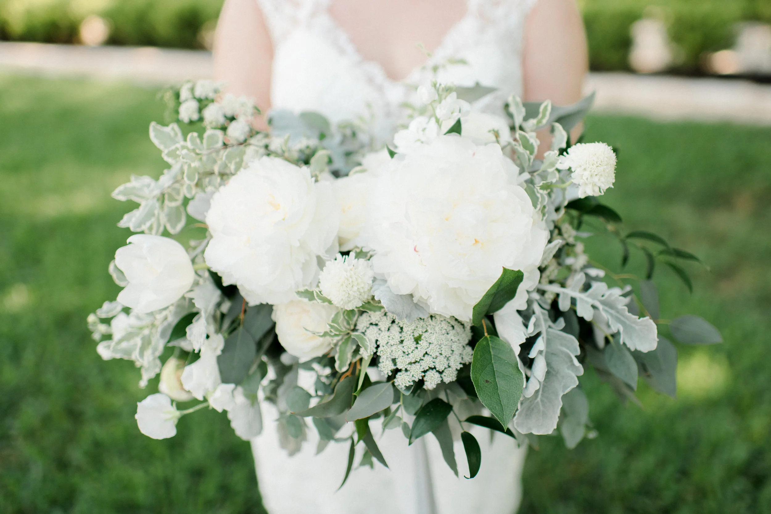 For Rachel's bouquet we used fluffy white peonies as the showstoppers that just continued to open up in that Texas heat. For accents we used white scabiosa, tulips and sweet peas among other touches. Her wedding was prime time for my favorite base— spirea. For the rest of the greens we used a mix of eucalyptus, some dusty miller for that dusty blue look, and my favorite green right now, variegated pittosporum. For the boutonnieres we used some fluffy white lisianthus and bits of greenery for accents.
