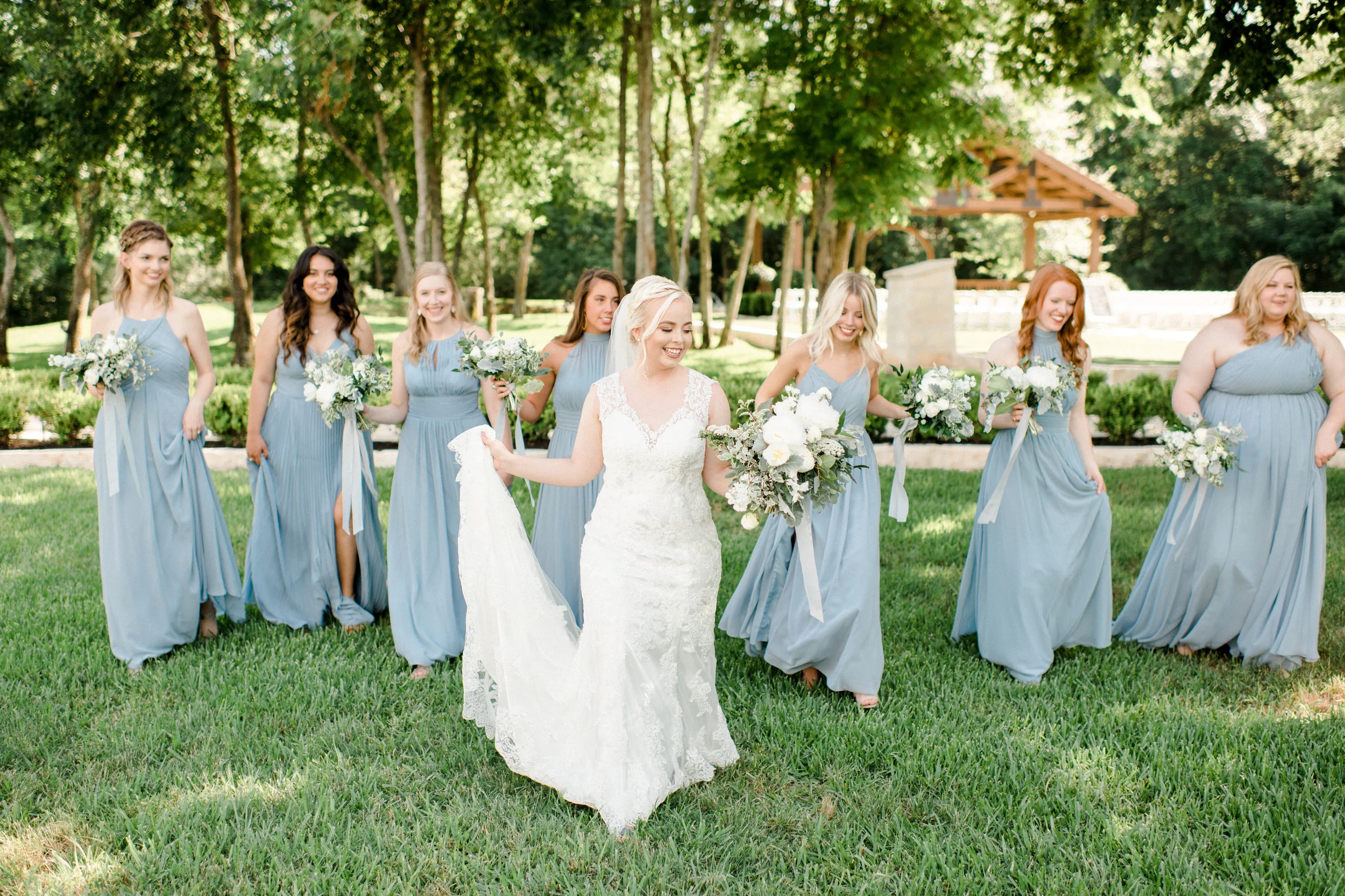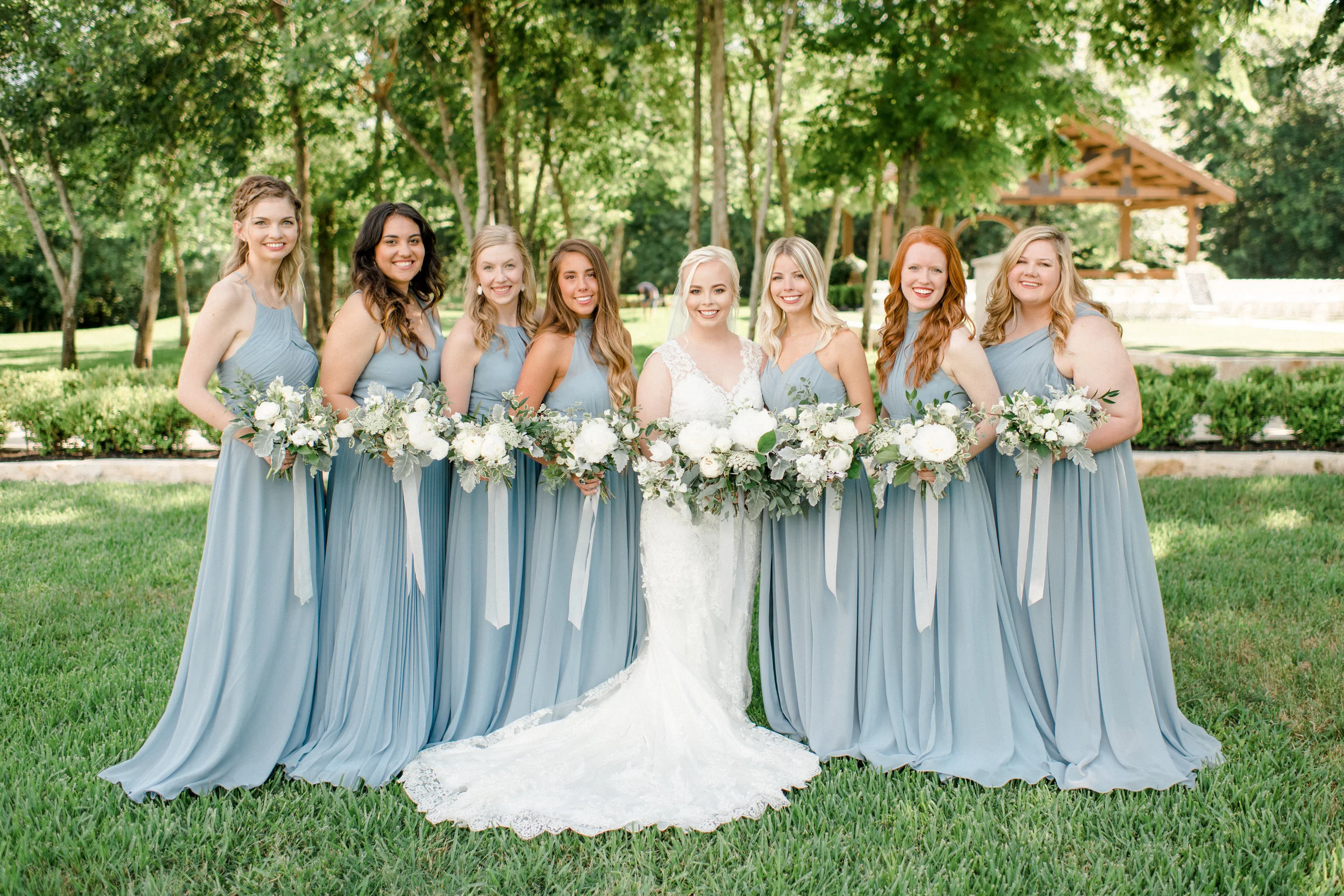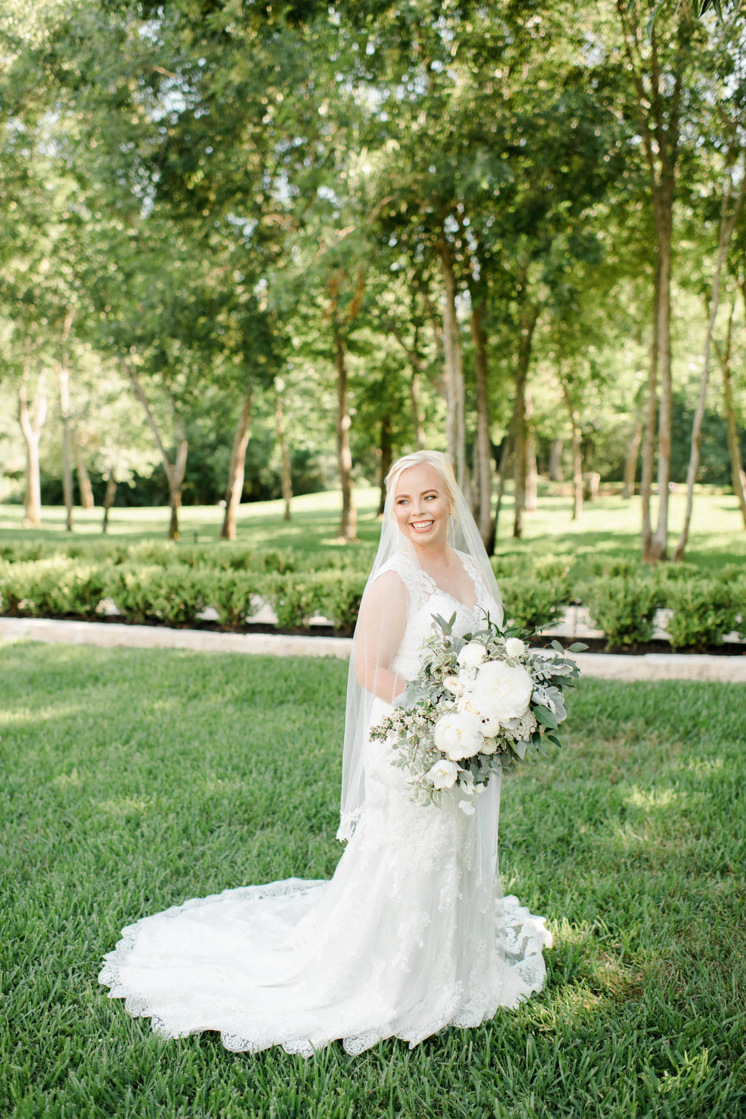 For Rachel's bouquet we used fluffy white peonies as the showstoppers that just continued to open up in that Texas heat. For accents we used white scabiosa, tulips and sweet peas among other touches. Her wedding was prime time for my favorite base— spirea. For the rest of the greens we used a mix of eucalyptus, some dusty miller for that dusty blue look, and my favorite green right now, variegated pittosporum. For the boutonnieres we used some fluffy white lisianthus and bits of greenery for accents.